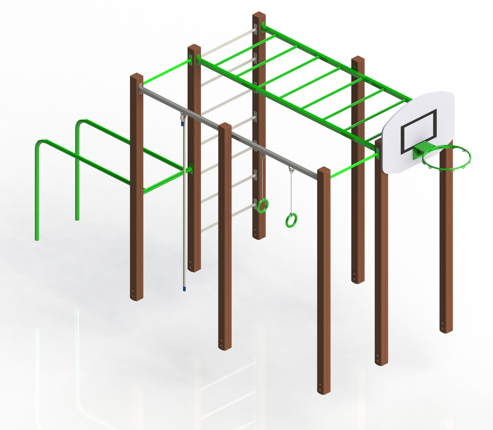 Комплекс має рукоходи, турніки, гімнастичні кільця, бруси, баскетбольне кільце.