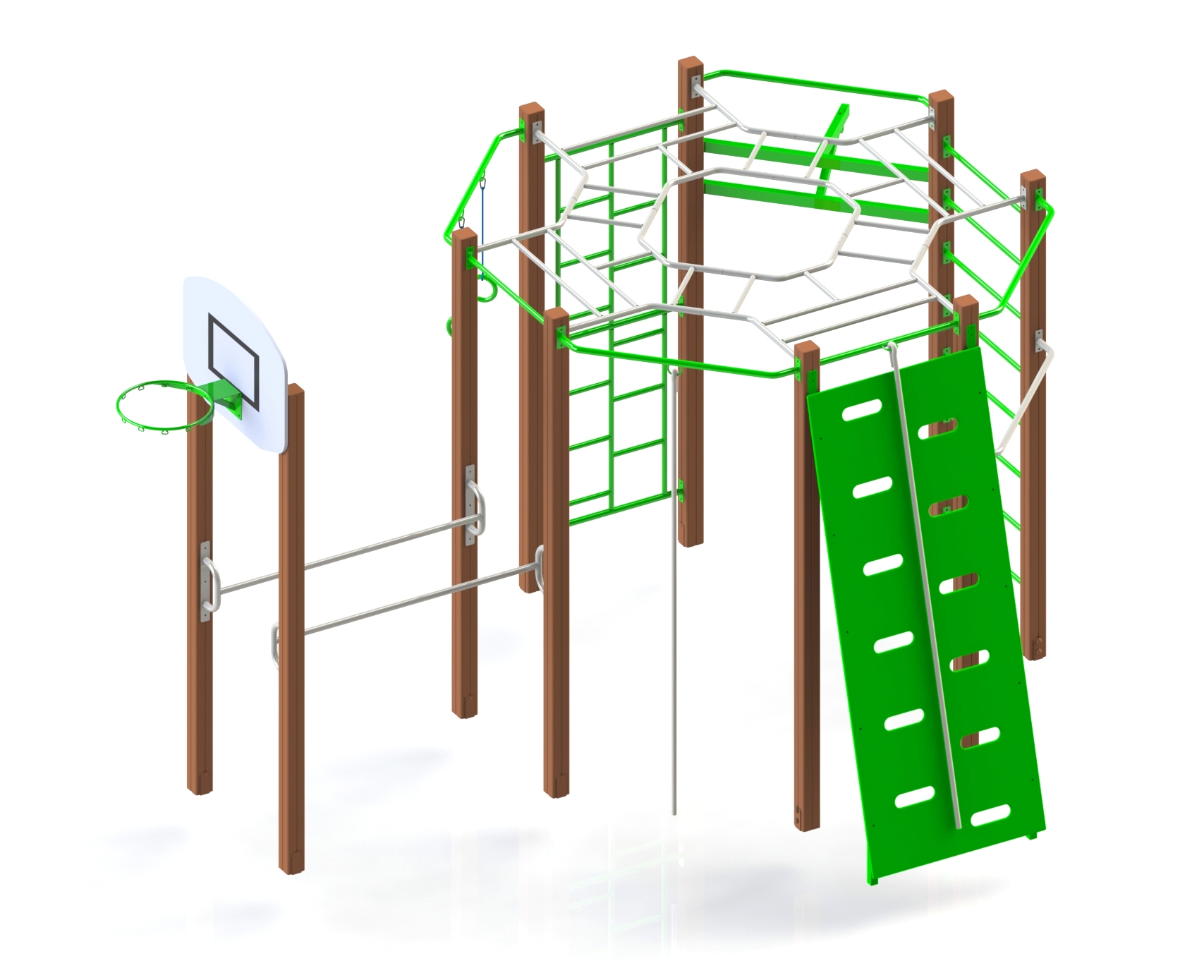 Гімнастичний комплекс призначений для розвитку у дітей координації руху, а також для занять фізичними вправами на відкритому повітрі. Гімнастичний комплекс являє собою єдину конструкцію, яка складається з рукоходу, ліани-драбини, прямих сходів, брусів, дошки скелелаза, кілець, канату та баскетбольного щита, закріплених на дерев'яних брусах.