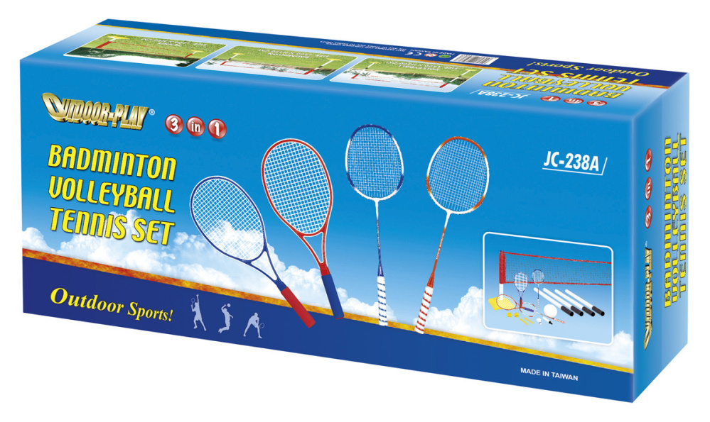 Сітка 3 в 1 Outdoor-Play КА238A для бадмінтону, волейболу, тенісу – комплект для ігор на природі. У комплекті складана сітка, яку можна налаштувати для гри у теніс, бадмінтон та волейбол. Це можливо завдяки можливості змінити висоту сітки. Як обтяжувач використовуються ємності, в які потрібно налити воду. Також у комплекті йде 2 ракетки для тенісу, два м'ячики для тенісу, дві ракетки для бадмінтону та воланчик до них, м'яч для волейболу та насос до нього.