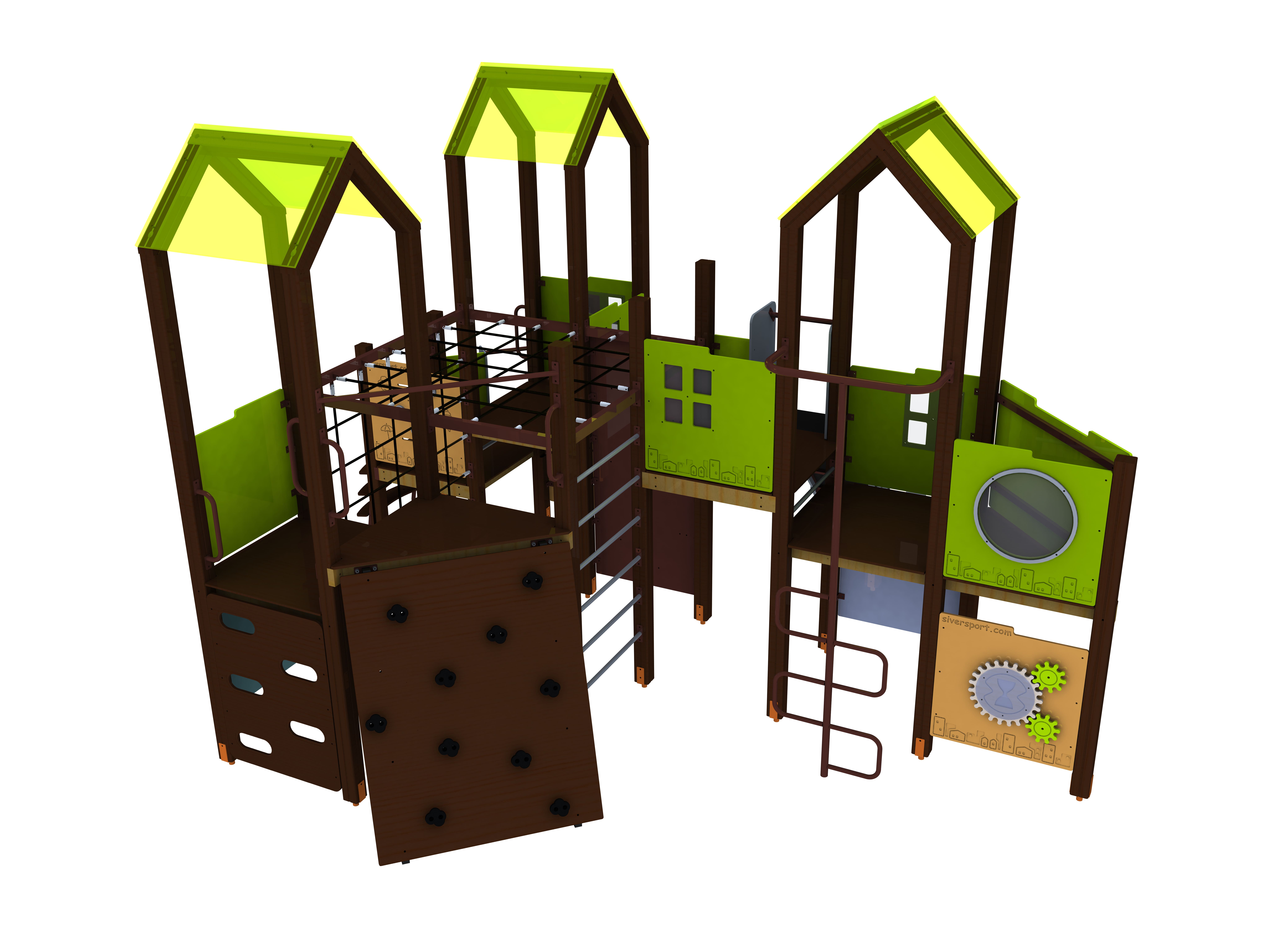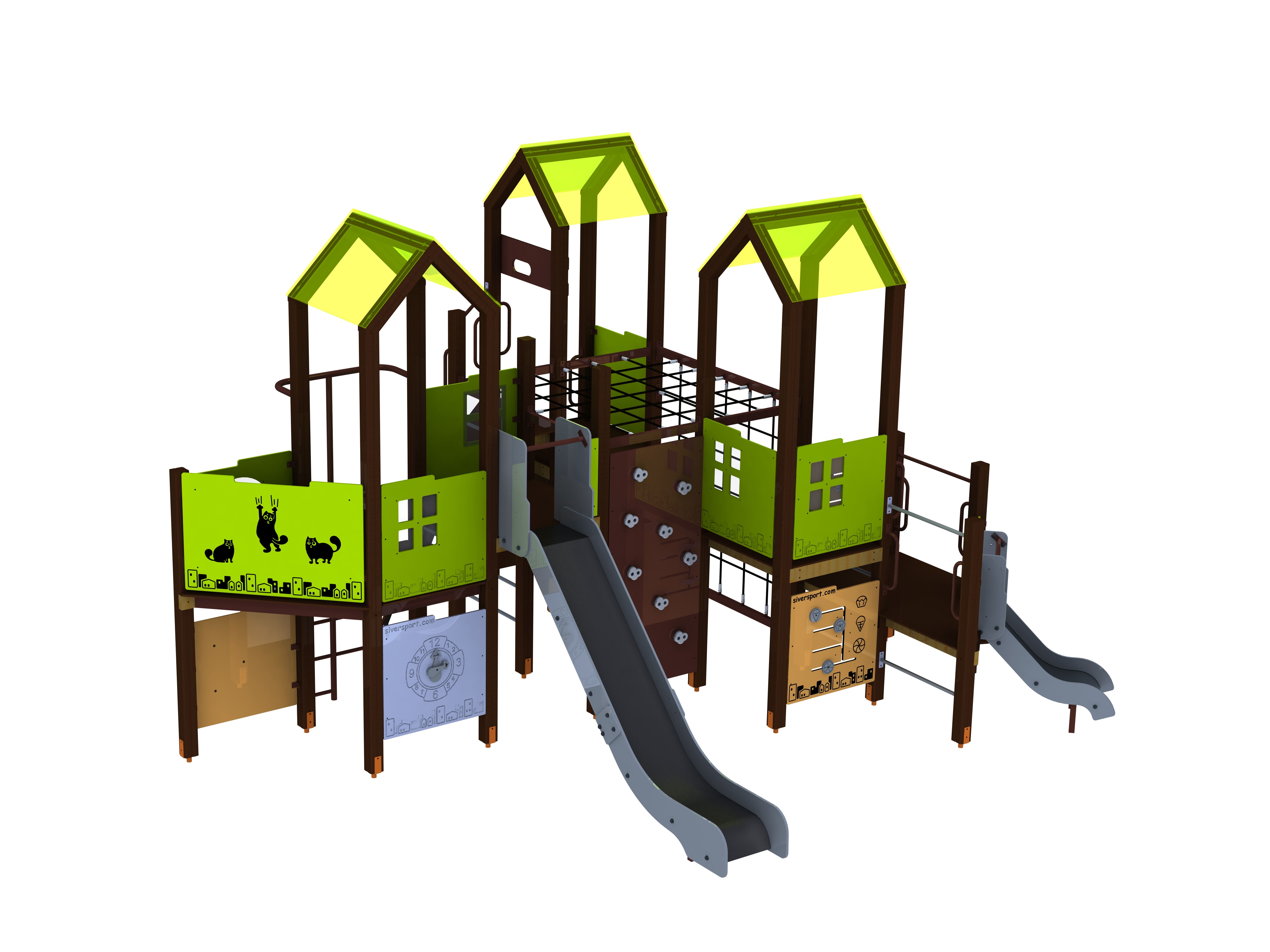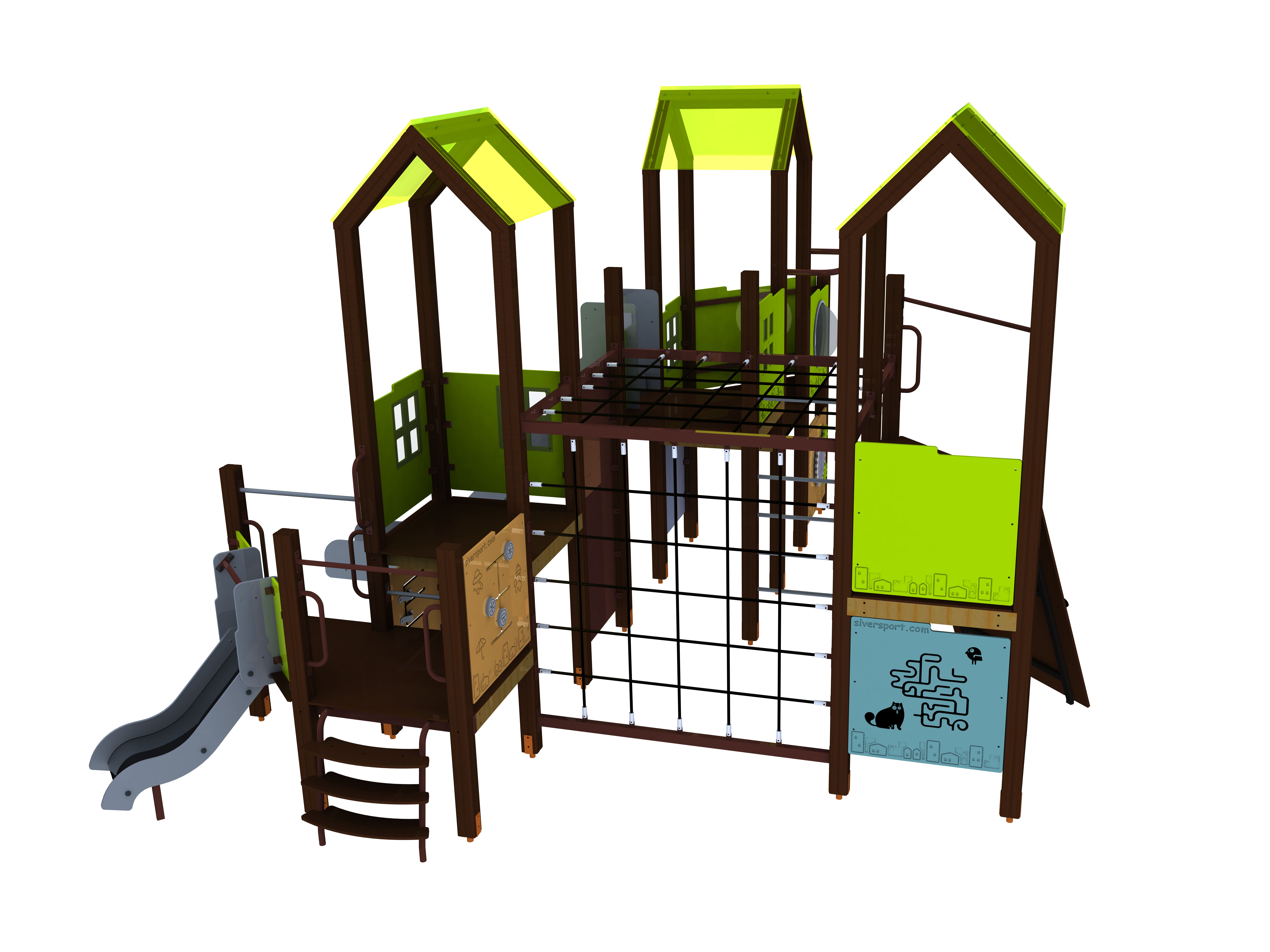 Детский игровой комплекс оснащен двумя горками – большой и малой, для детей всех возрастов, интерактивными досками для развития логики и моторики детей, лазальными сетками, разнообразной лестницей.