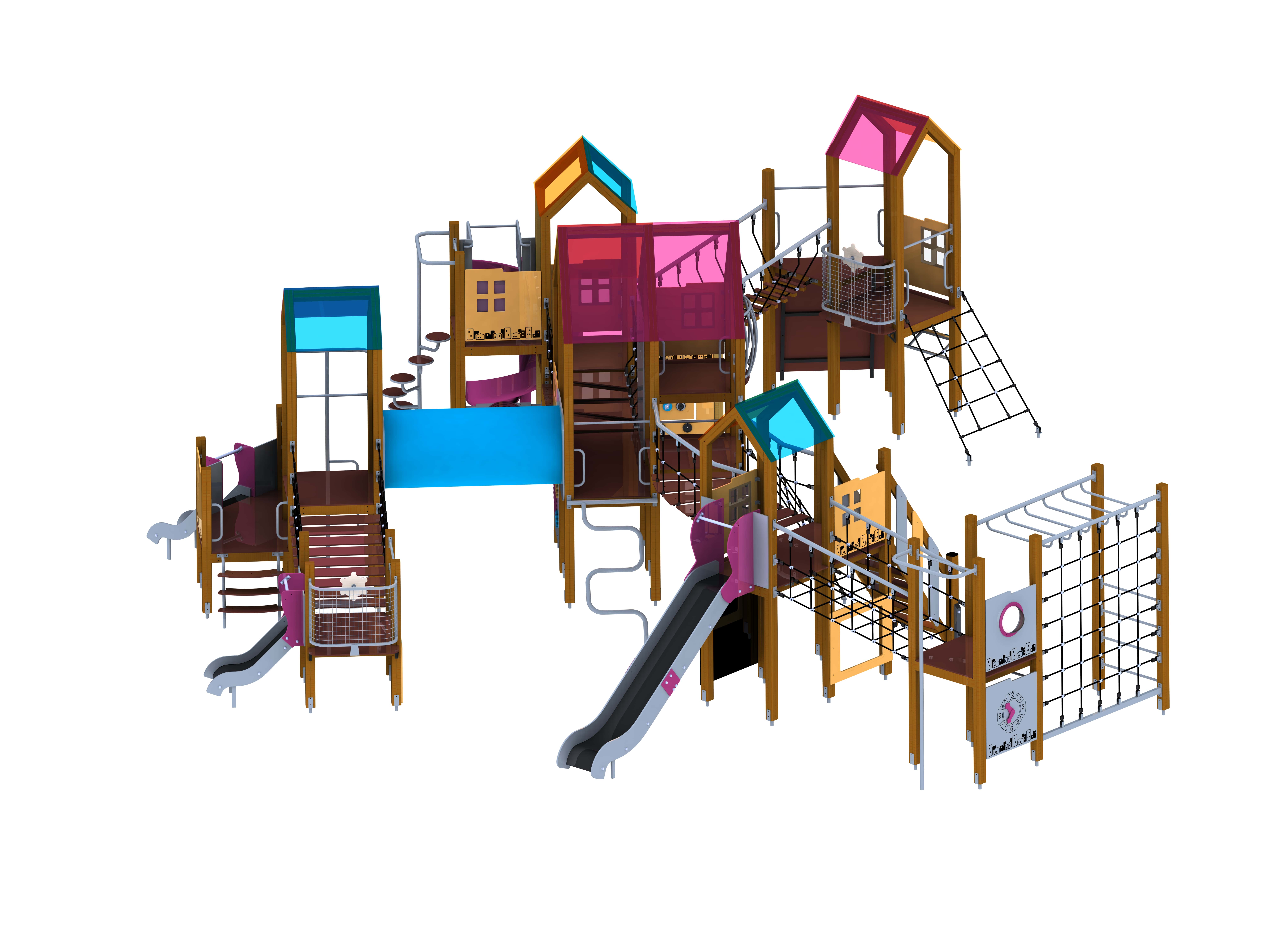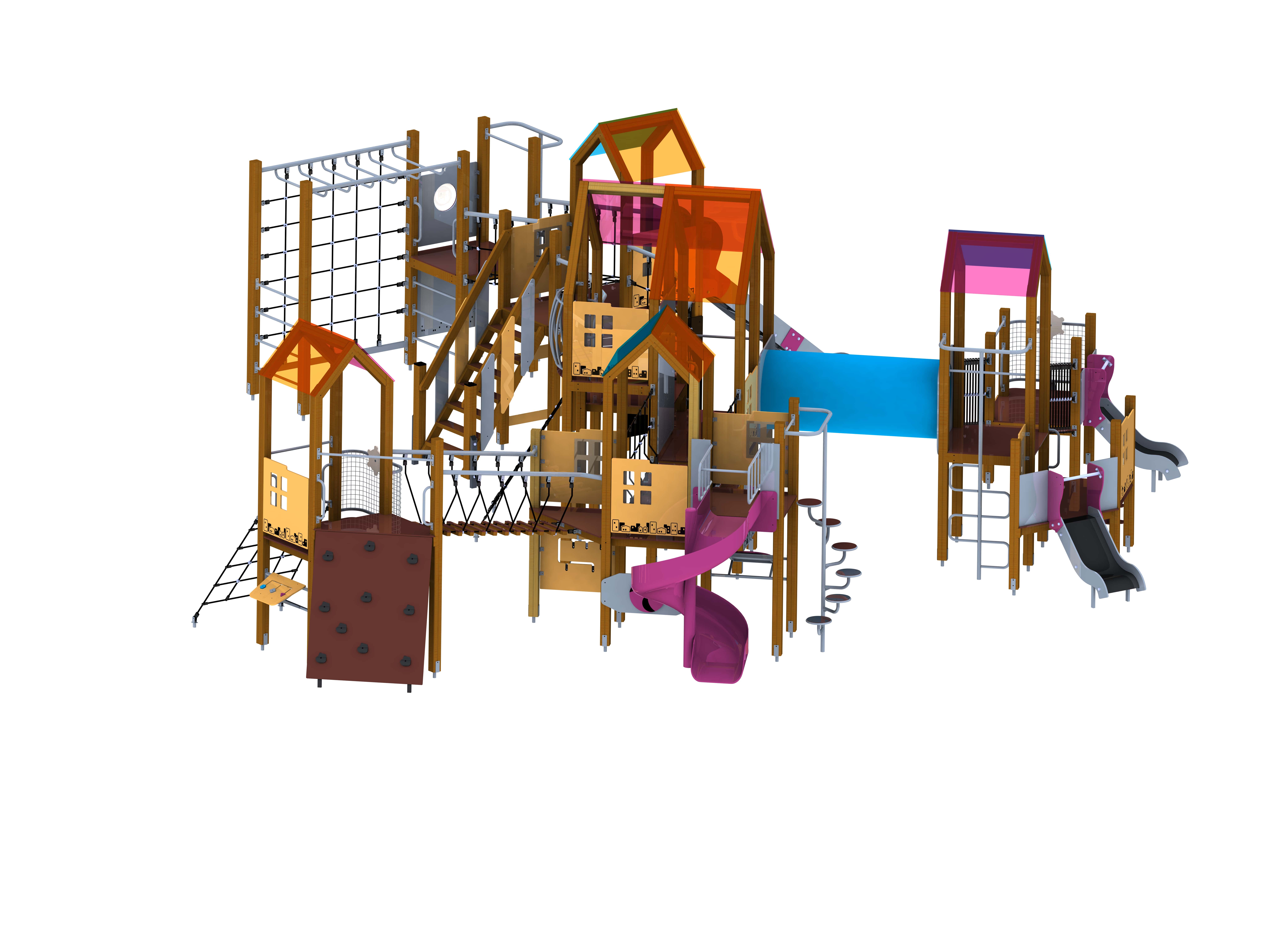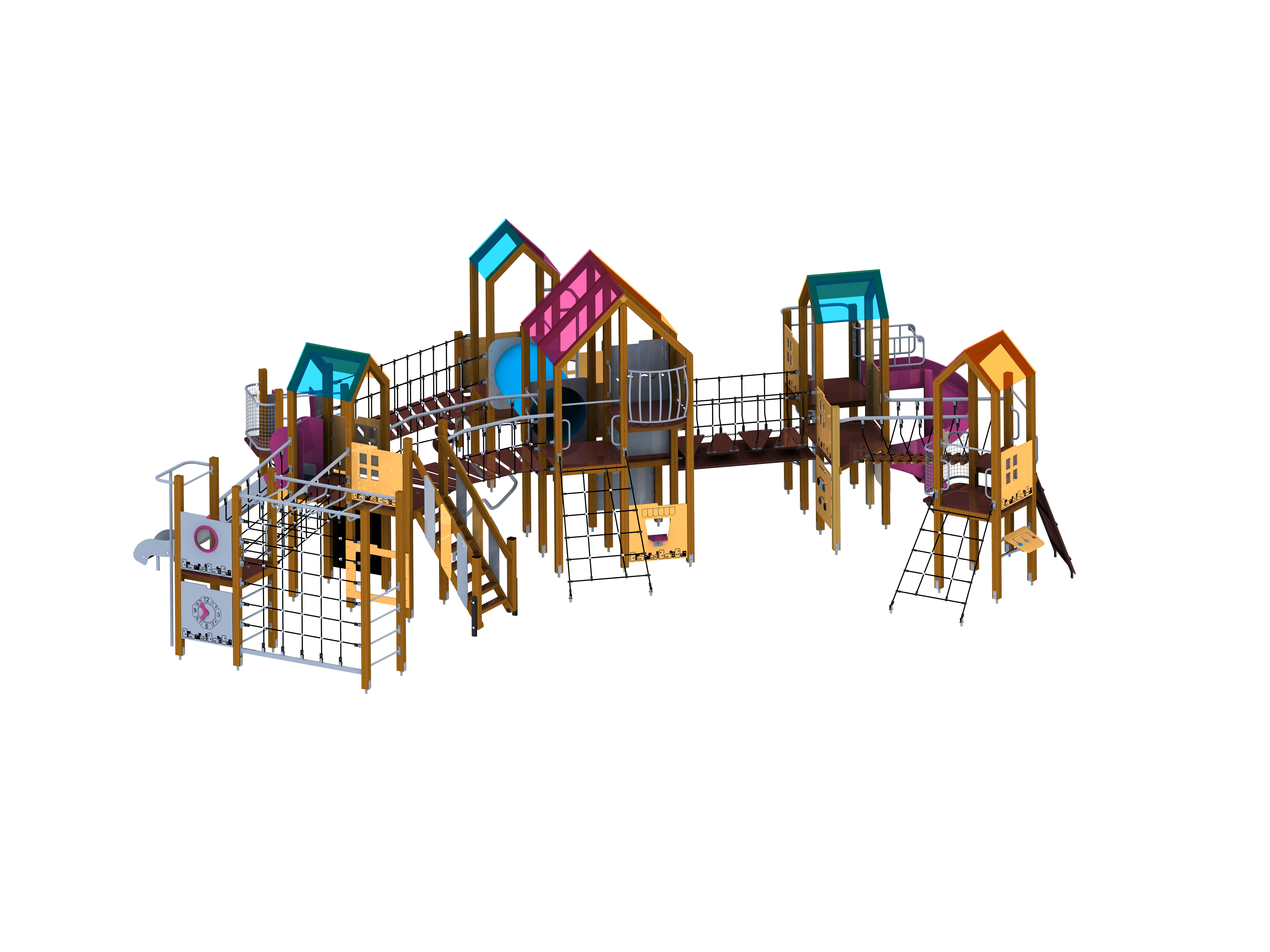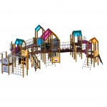 Детский игровой комплекс оборудован массой игровых элементов: как минимум 5 "островков", вокруг которых расположены горки, лестницы, турники, лазальные сетки, мостики разного характера, соединительные тоннели, а также интерактивные доски, где дети также могут развлечь себя.