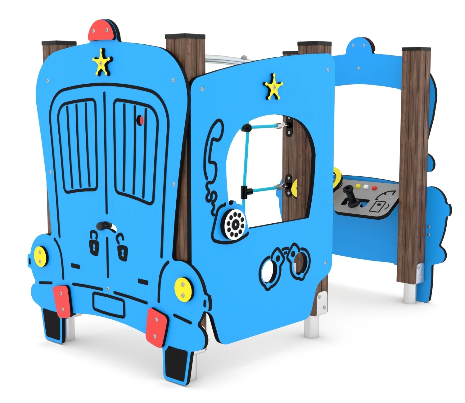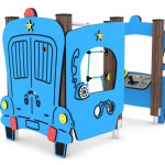 Машина синего цвета представляет собой имитацию настоящей машины, где ребенок может представить себя на месте водителя. В корпусе машины также встроены интерактивные панели, турники для того чтобы дети могли лазать на них.