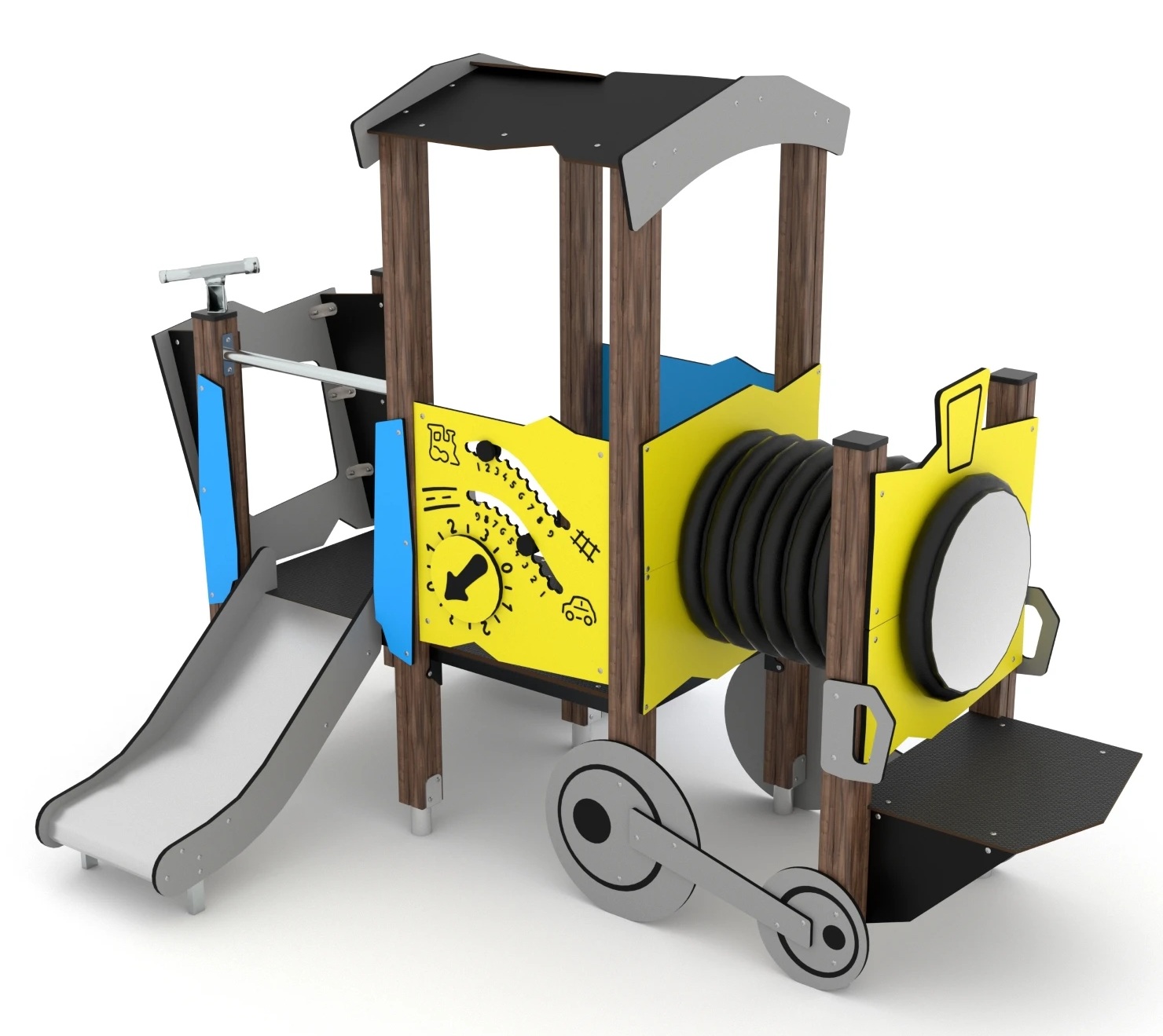 Игровой паровоз - прекрасный элемент для детской площадки, он имеет горькую, интерактивную панель и место, где ребенок может представлять себя машинистом.