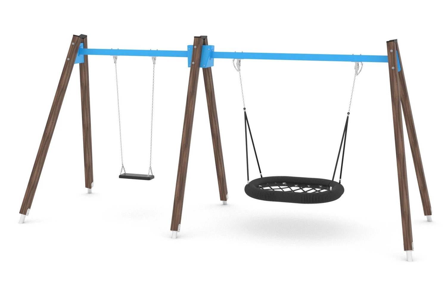 Качели комбинированные созданы из двух различных отдельных качелей. Одна более простая, другая большая подвесная качели. Стойки деревянные, а сами качели закреплены на металлических основаниях.