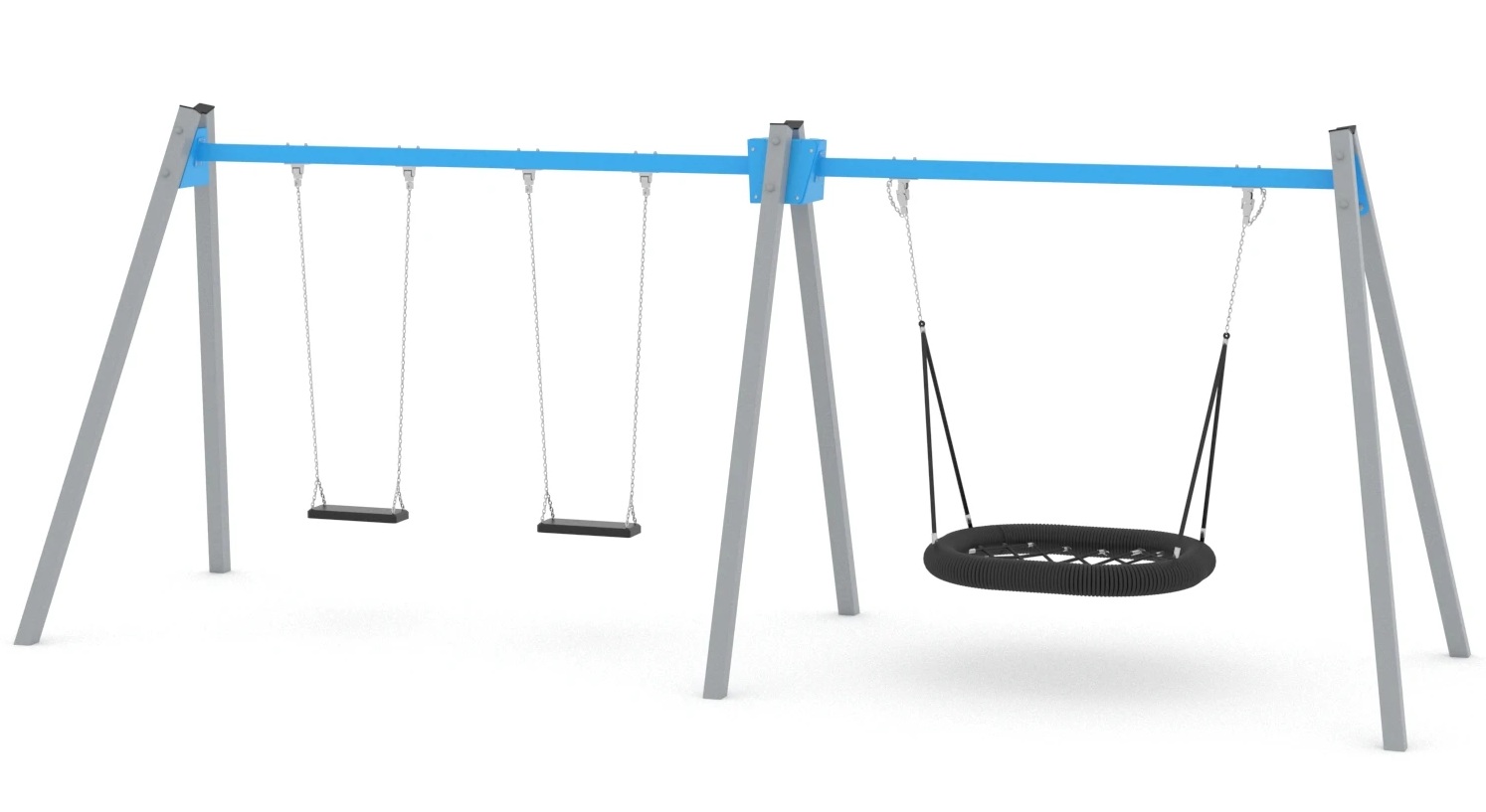 Эти качели имеют три места, на которых могут качаться дети. Обе качели прикреплены к металлическому основанию крепкими цепями. Также имеются металлические стойки.