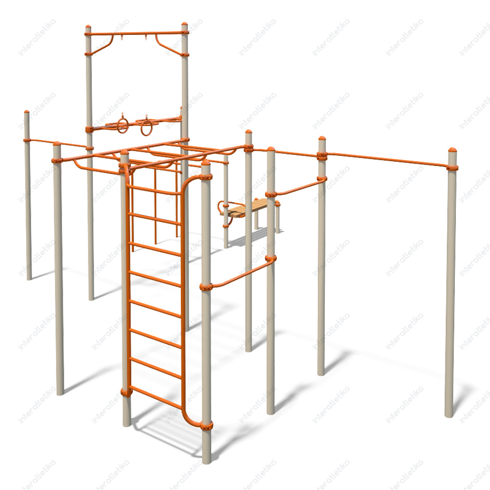 Це багатофункціональний спортивний комплекс для воркауту, виготовлений із міцного металу з антикорозійним покриттям. Містить турніки, рукоходи, шведську стінку, лаву для пресу — усе необхідне для тренування сили, витривалості та координації на свіжому повітрі. Ідеально підходить для занять як дорослих, так і підлітків.