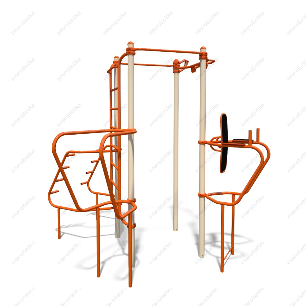 Це вулична станція мультифітнес, яка поєднує кілька тренажерів для комплексного розвитку м’язів верхньої і нижньої частини тіла. Вона дозволяє виконувати вправи на прес, спину, груди та руки, використовуючи вагу власного тіла.