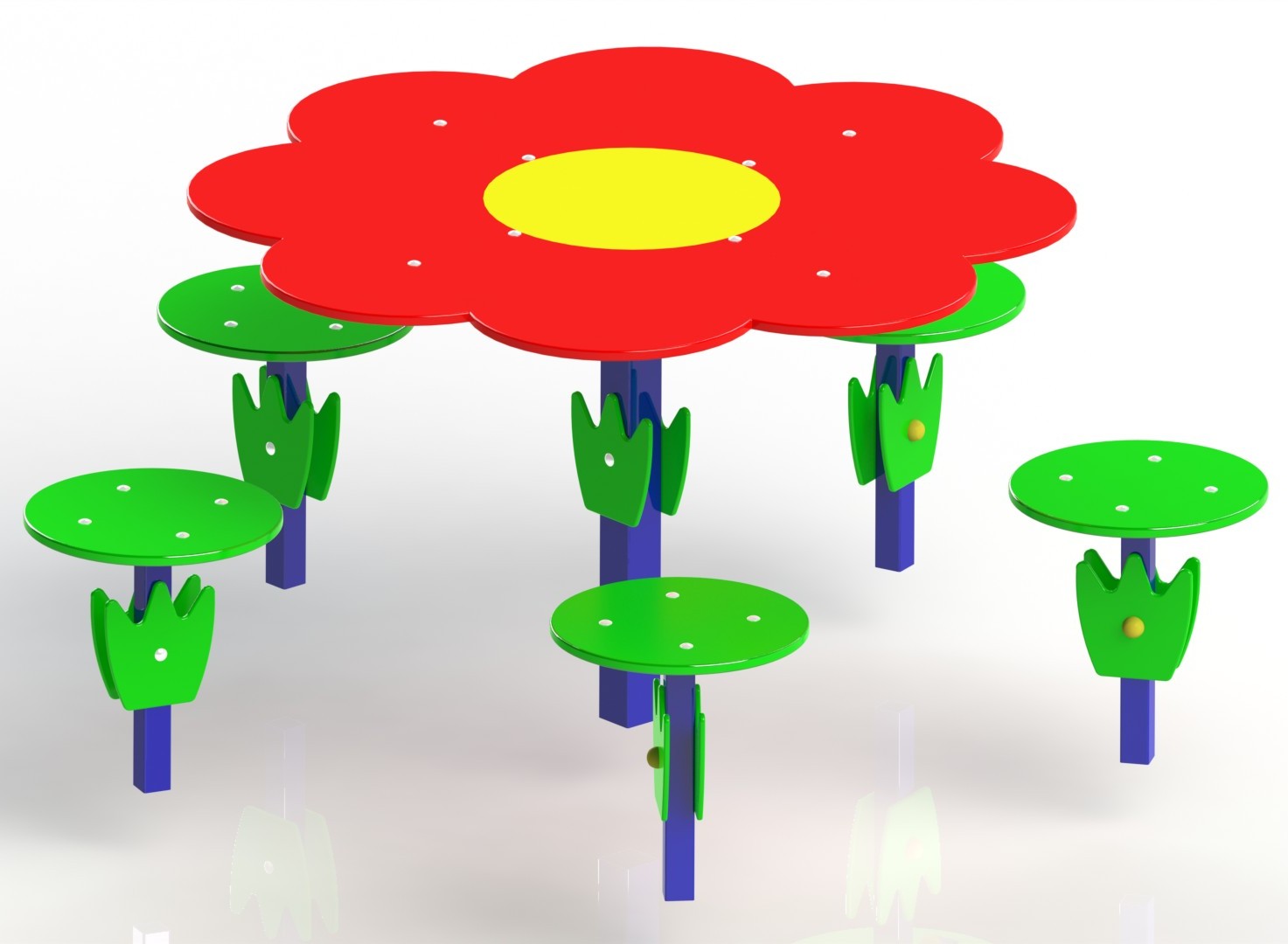 Столик в виде цветка, а стулья в форме ярких ростков.