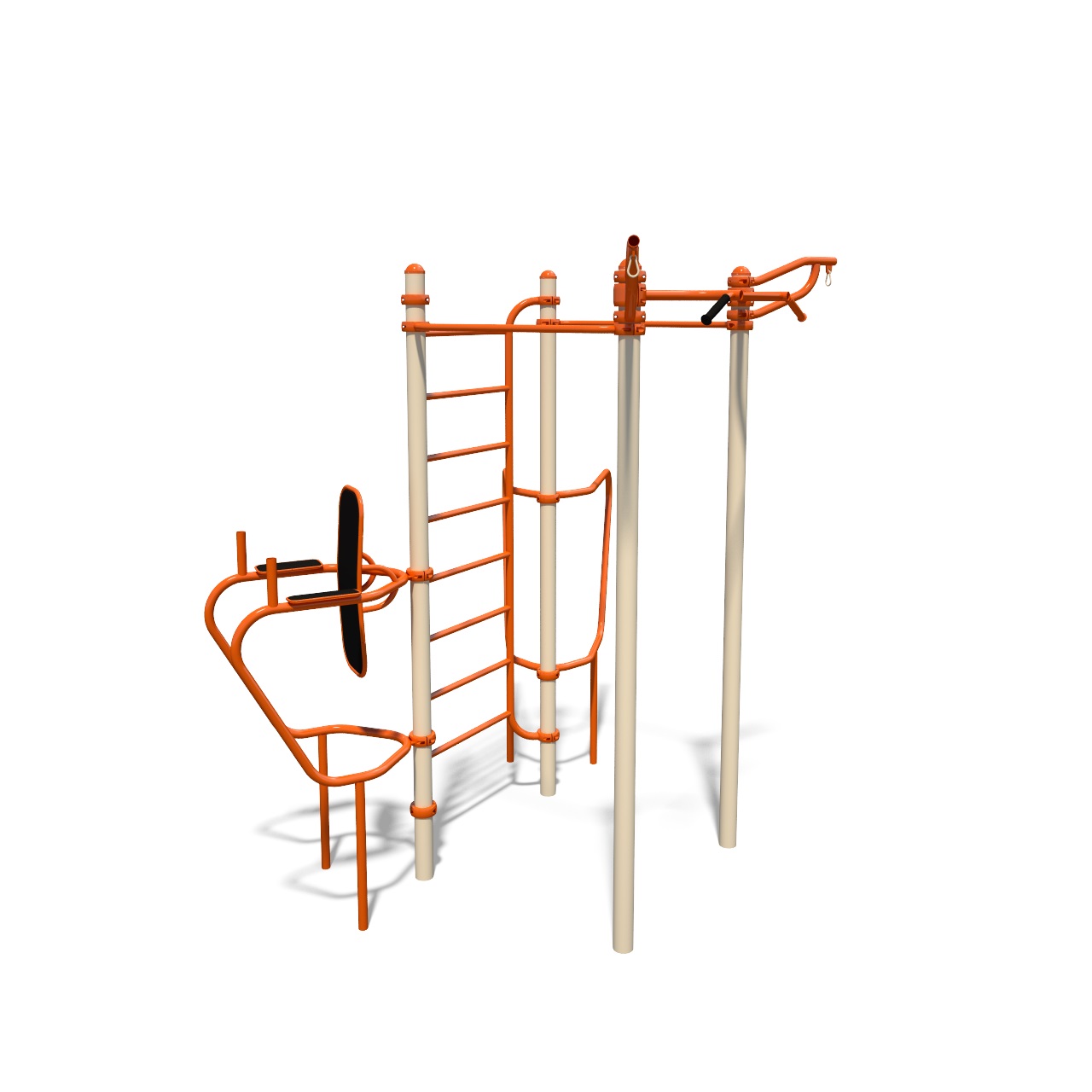 Це вулична станція мультифітнес, яка поєднує кілька тренажерів для комплексного розвитку м’язів верхньої і нижньої частини тіла. Вона дозволяє виконувати вправи на прес, спину, груди та руки, використовуючи вагу власного тіла. Конструкція стійка до атмосферних впливів, тому ідеально підходить для встановлення у дворах, парках чи на спортивних майданчиках.