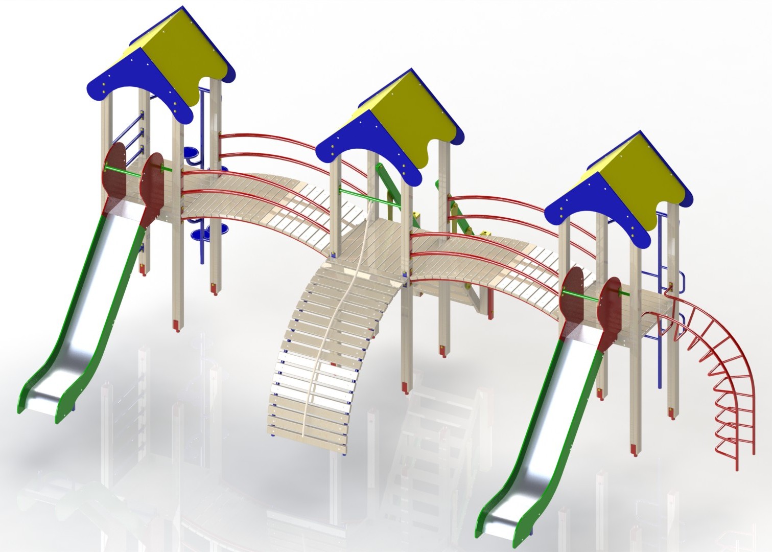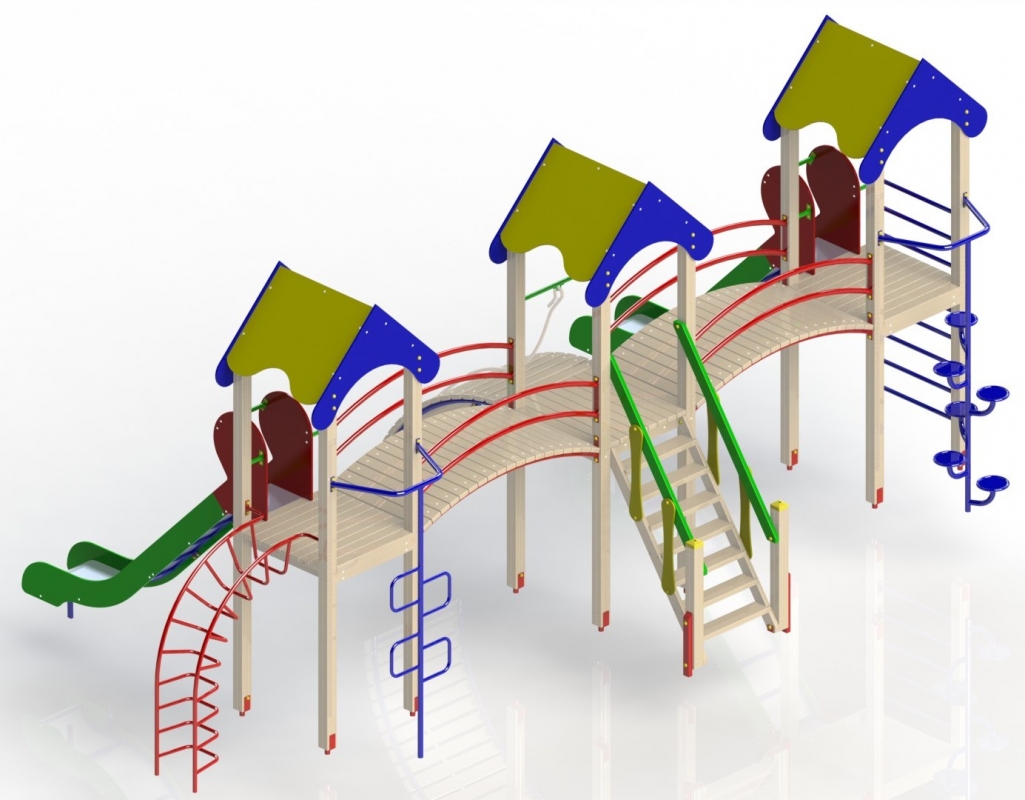 Комплектация: горка-спуск большая 2 шт., радиальный подъем, ступенчатый подъем 2 шт., мостик перехода, шведская стенка, канатный подъем