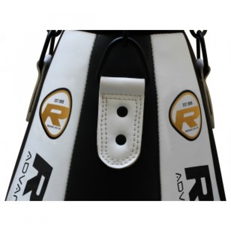 Боксерская груша капля RDX изготовлена вручную в Великобритании. Мешок выполнен из кожи высокого качества. Набивка состоит из нескольких слоев. На внутренней части идет плотное пенное наполнение, а на внешней – гелевое (IMT-гель). Груша позволяет отрабатывать все виды ударов, включая апперкот. Крепится снаряд на четырех кольцах (цепи не входят в комплект). Груша подходит для тренировок как в условиях зала, так и дома.