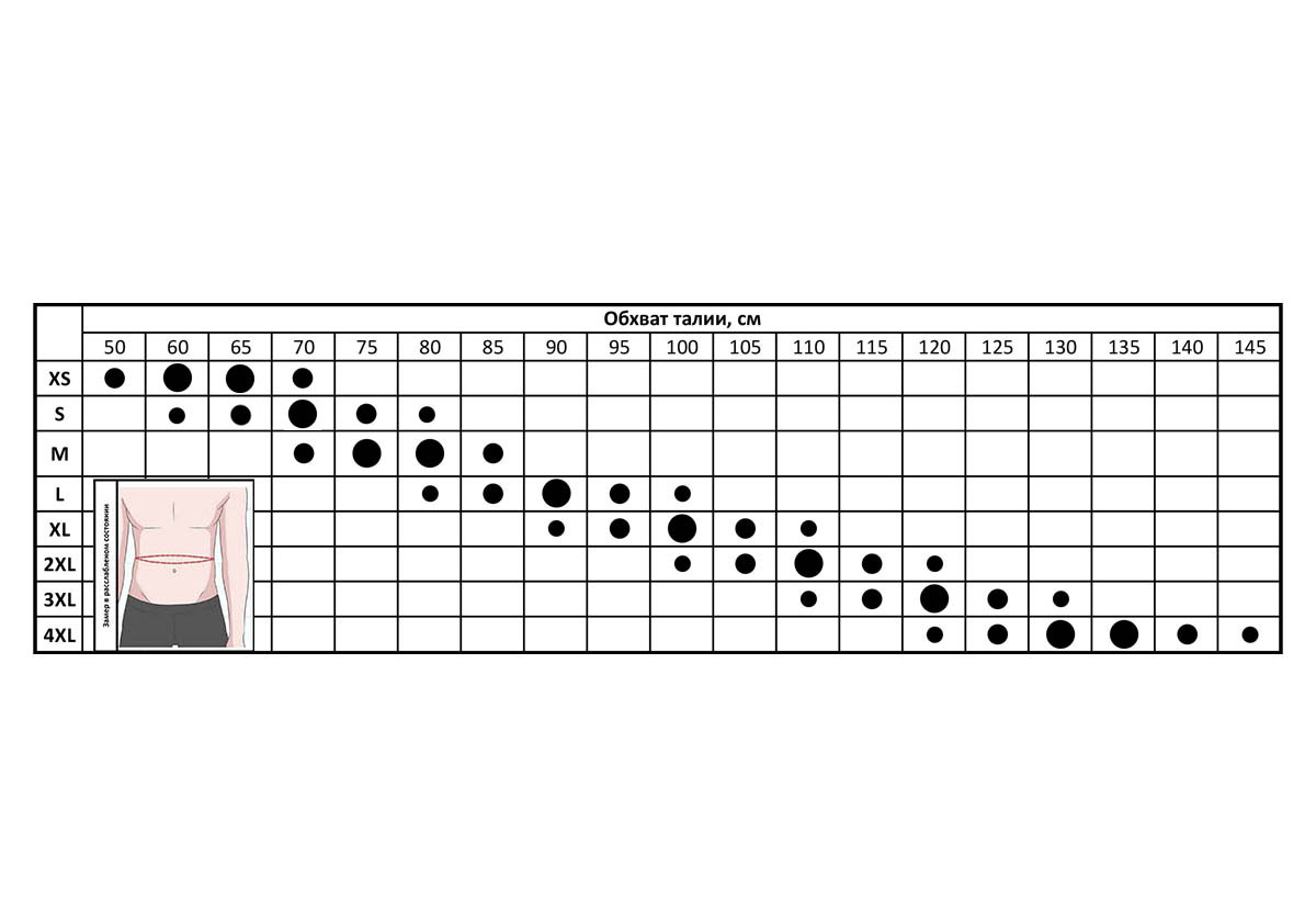 Сітка розмірів поясів XS-4XL складає діапазон від 50 см до 145 см: від найменших розмірів до розміру 4XL. Також можливе виготовлення практично будь-якого розміру на замовлення клієнта.