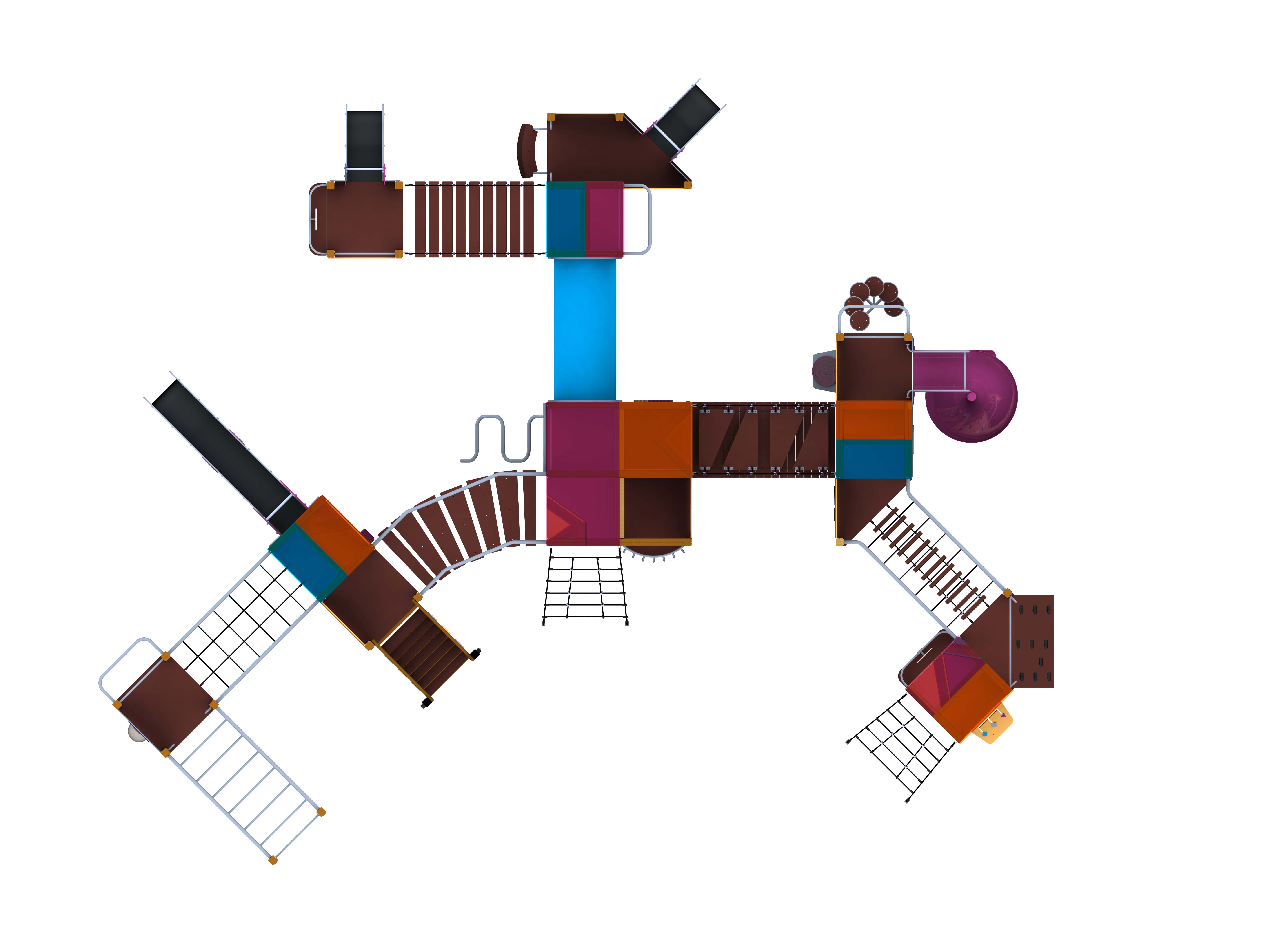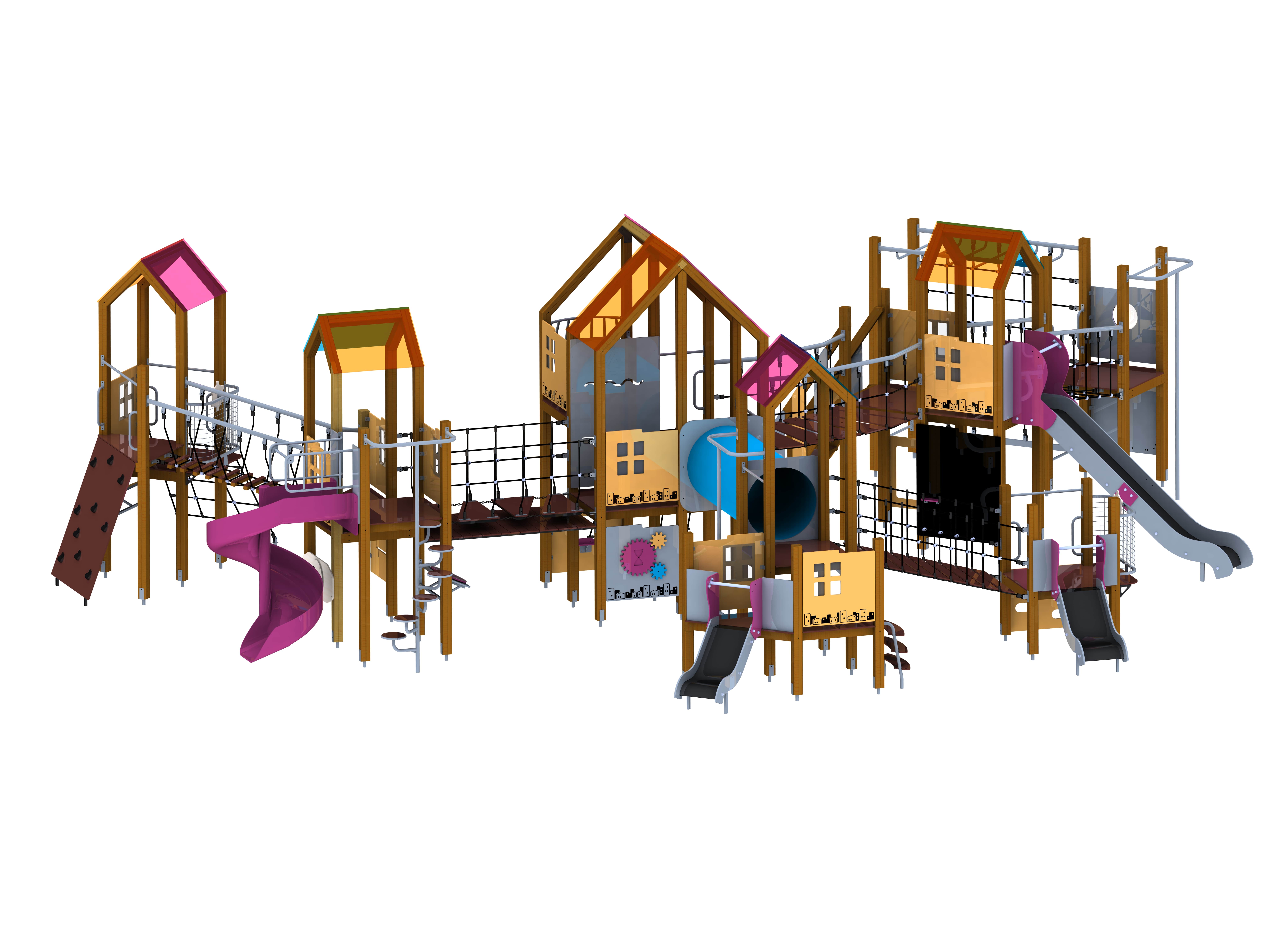 Дитячий ігровий комплекс обладнаний масою ігрових елементів: як мінімум 5 "острівців", навколо яких розміщені гірки, сходи, турніки, лазальні сітки, містки різного характеру, поєднувальні тунелі, а також інтерактивні дошки, де діти також можуть розважити себе.