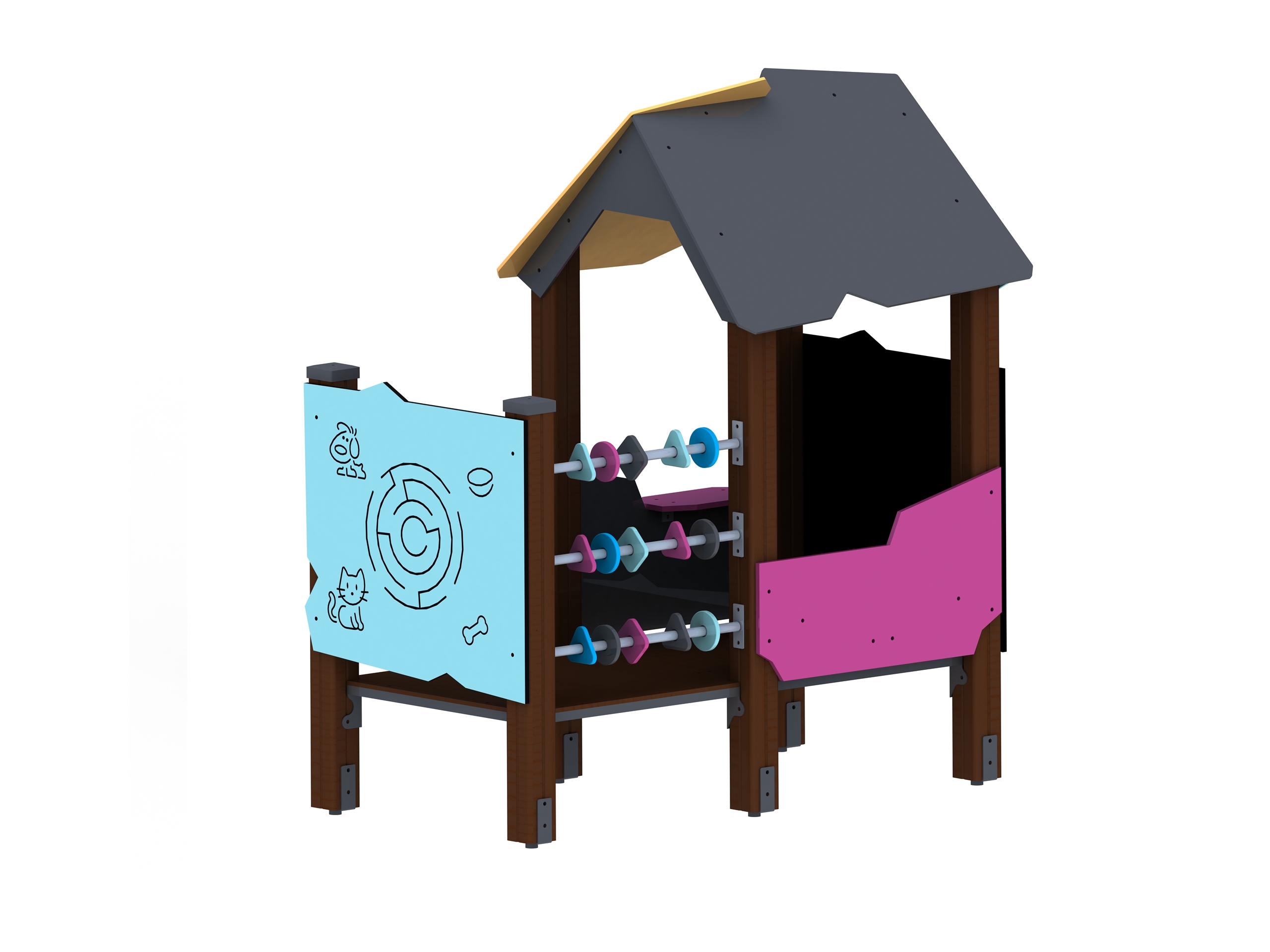 Цей дитячий будиночок оснащений місцем для відпочинку дитини, інтерактивною дошкою - тут є лабіринт, який поєднує песика з його їжею та котика з його. Також наявні різні фігури, де дитина оже залучити свою пам'ять і логіку, аби орієнтуватись, де яка фігурка.