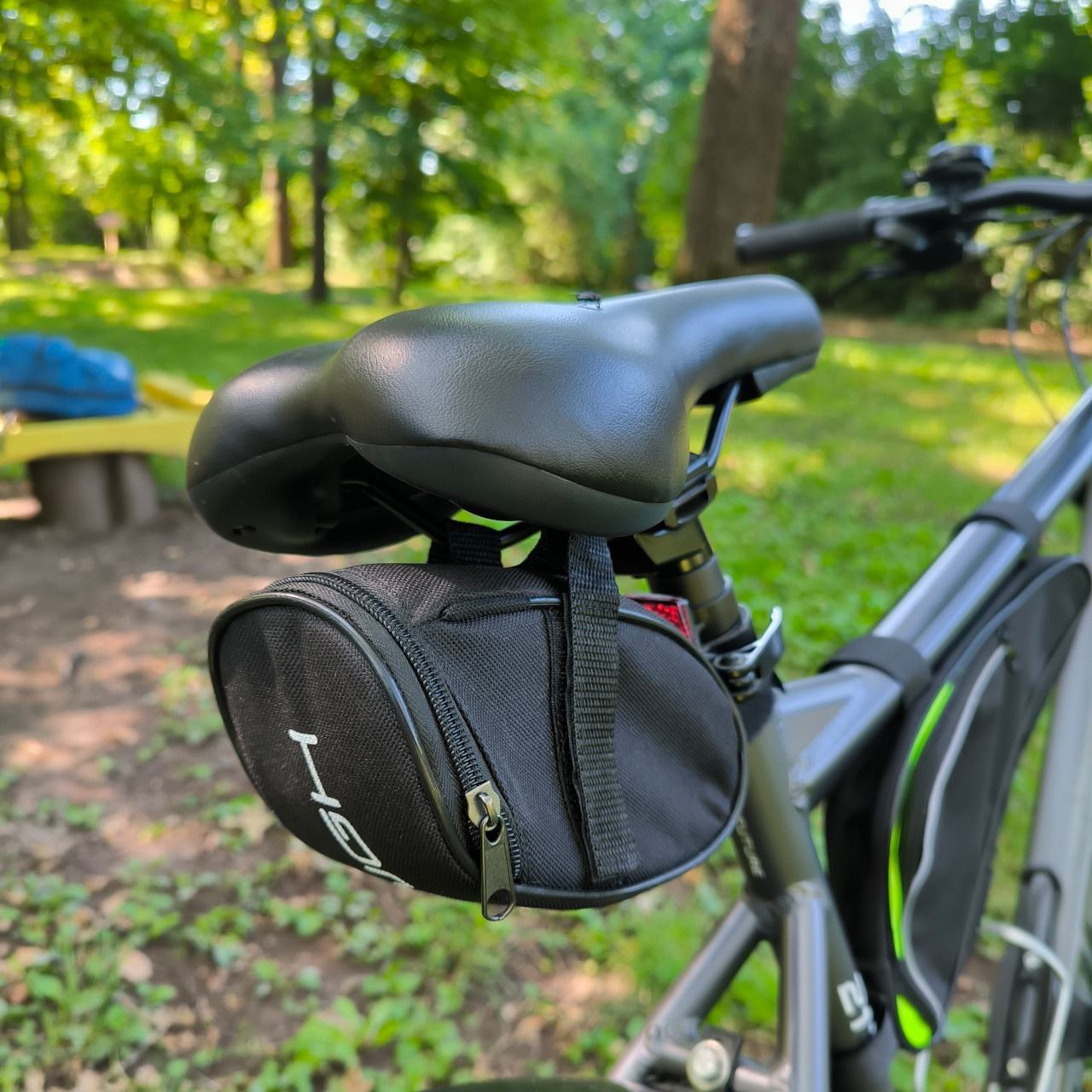 Велосипедна сумка під сідло виготовлена із зносостійкого вологостійкого поліестеру, призначена для зберігання необхідних аксесуарів у дорозі, таких як: латки для камери, набір шестигранників, ключі, телефон та інше. Сумка фіксується під сидінням за допомогою трьох стяжок на липучках. Сумка має одне внутрішнє відділення, яке застібається на блискавку.